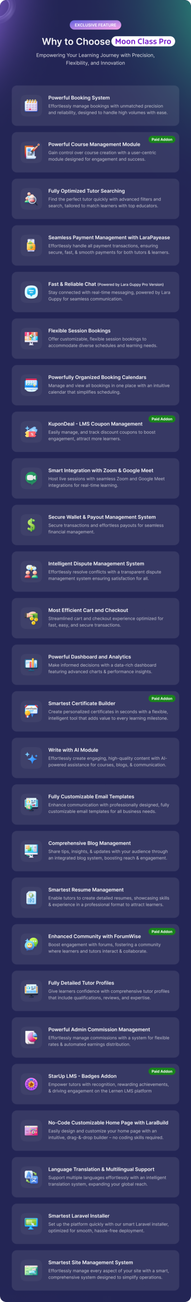 Moon Class Pro supports premium modules to extend platform functionality, including: